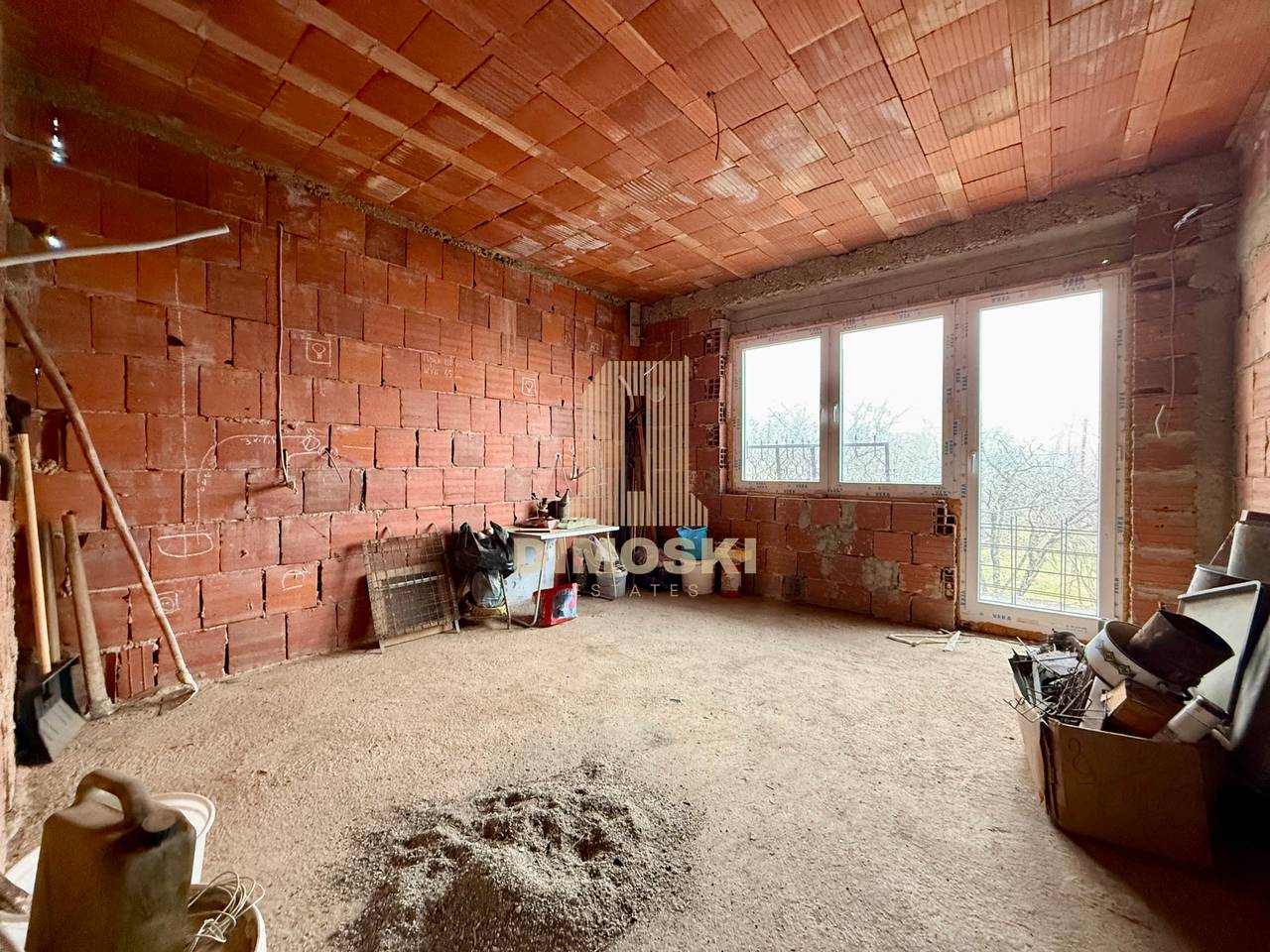 Долниот кат од куќата е целосно завршен, потребно само да се доврши купатило и опреми, додека горниот кат и поткровјето се во фаза на карабина.